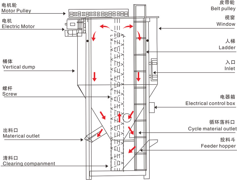 ◆Helical circular mixture,fast and equal stirring. Working principle The JWQF series vertical stirrers are able to perform even mixture for large volume of materialin short mixing time by utilizing the paddles rotation to gather the material from the bottom of dump center to the top,shed the material flow back to the bottom and complete the mixing function in a stort period of time. |  |
